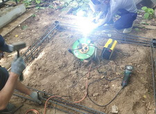 Первым этапом работ будет создание добротного фундамента. Для этого мы вкручиваем четыре металлические сваи, к которым привариваем арматурный каркас.