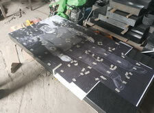Далее начинается второй этап – переход к созданию элементов памятника. Первая подготовленная деталь – полукруглая арка. Трафарет на арку отпескоструили, сделали надпись сусальным серебром